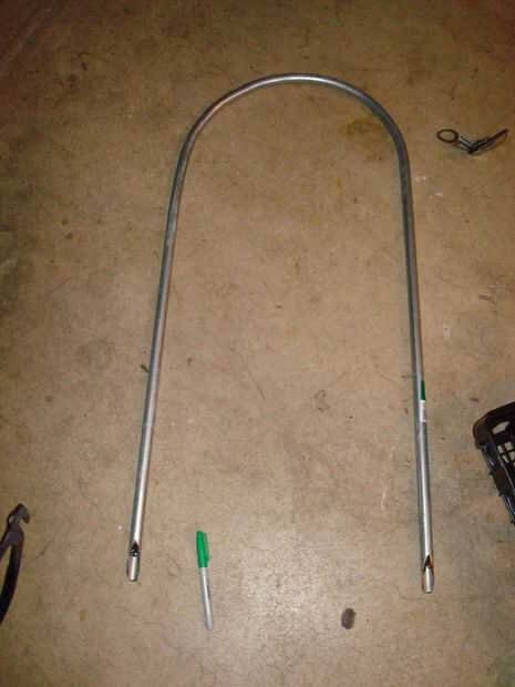 Quería tener un trailer que fue 16" amplia (para acomodar la tina había planeado sobre el uso) así tomó un trozo de conducto eléctrico, corte a la longitud (~ 72") y entonces, utilizando la dobladora de tubo, doblado lo que era una forma de U. Costó un poco conseguir que incluso (la curva fue mayor en un lado contra el otro, como se ve en la foto), pero después de algunos intentos de doblado/enderezado, pude conseguirlo lo suficientemente cerca.