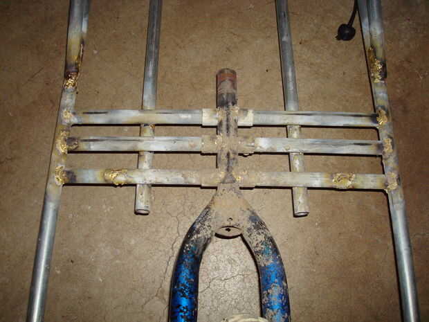 El montaje de la horquilla ahora estaba listo para acoplarse con el resto del trailer, que era simplemente un caso de soldadura de cada soporte en la parte inferior del marco en el lugar deseado. Una vez en el lugar el conjunto de horquilla, ajusté el tenedor otra vez para que la rueda sería perpendicular al remolque (en teoría) y luego soldar los conectores a los soportes. El último paso en este proceso fue soldar la horquilla a los soportes. (Mientras que resultó, la rueda no era totalmente perpendicular al remolque... Supongo que sólo mide una vez y dos veces.)