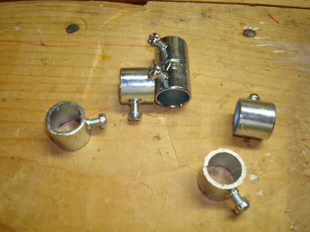 Una vez que los agujeros fueron perforados en la horquilla, me deslicé los soportes a través de los agujeros. Antes de soldar la horquilla soporta sobre la estructura, me corte los conectores a la mitad y, después de presentar por el interior por lo que encajaría, que les deslizarse sobre los soportes por lo que uno estaba en cada lado de la horquilla. Enderezó la horquilla (lo mejor que pude) y apretar cada conector para que (en teoría) la horquilla seguiría siendo recto y con el resto del trailer.