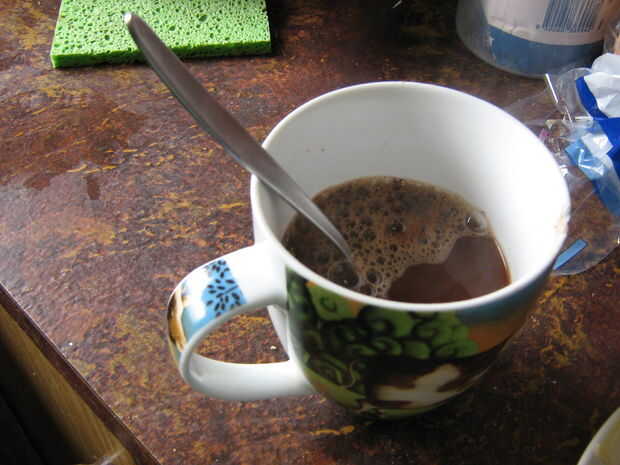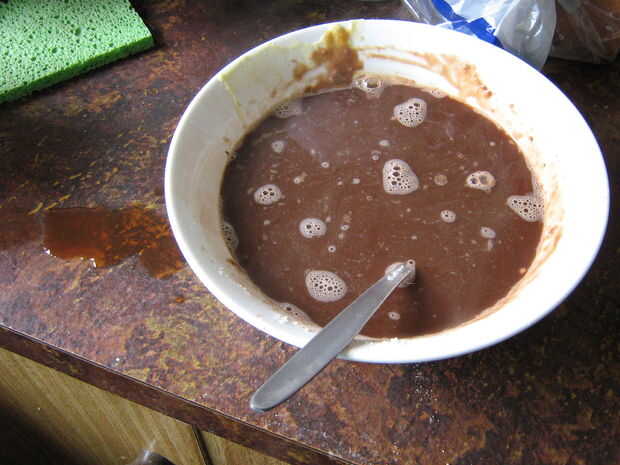 Disolver 3 cucharadas de cacao y tres de azúcar en alrededor de 3/4 taza de agua hirviendo, en una taza. Vierta esta mezcla sobre la masa. No intente mirarlo.