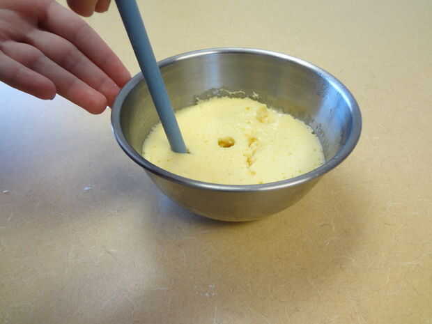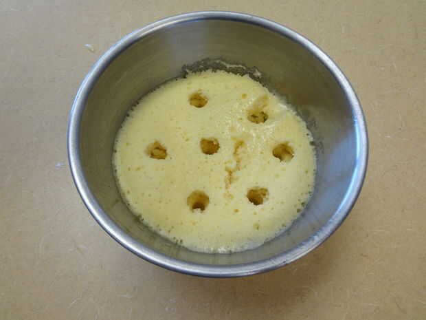 Pincha 7-8 orificios en el centro de la torta con el extremo de una cuchara de plástico.