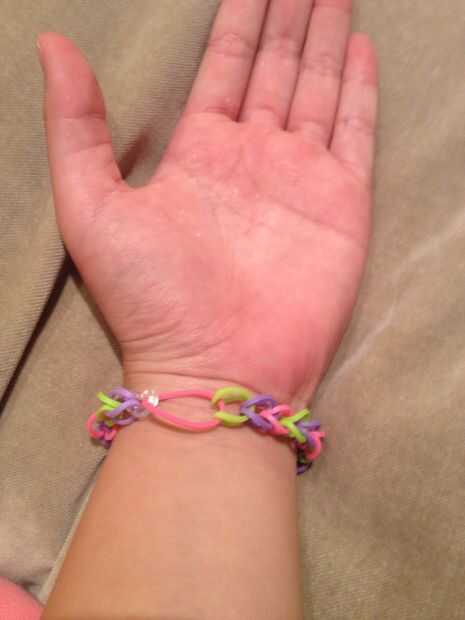 esto es una pulsera de nivel intermediaria, se puede hacer muy fácilmente.Fuentes: 3 colores de bandas en telar, telar del arco iris y un gancho.Paso 1: Empezar por colocar dos bandas blancas en forma de 'v' en el inicio del telar.Paso 2: El lugar un