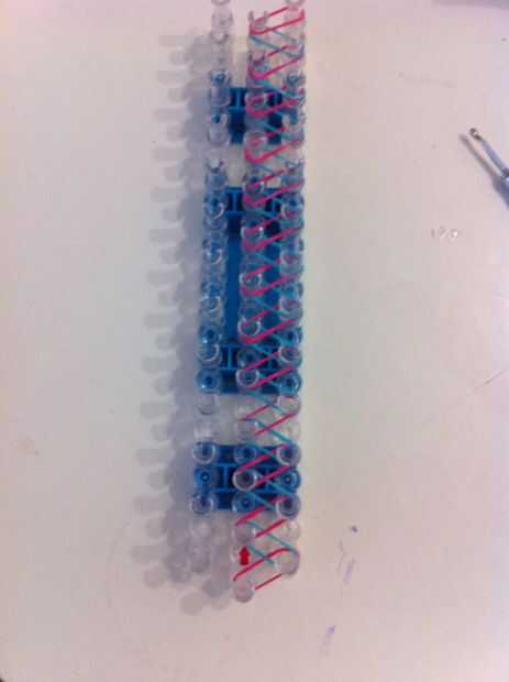 he modificado este video tutorial para crear una pulsera bigote! ¡ Disfrute!Paso 1: Se necesita: una tira de las clavijas de un telar del arco iris, dos colores de bandas (mina son de color rojo para las bandas de encuadre y plata para las bandas de