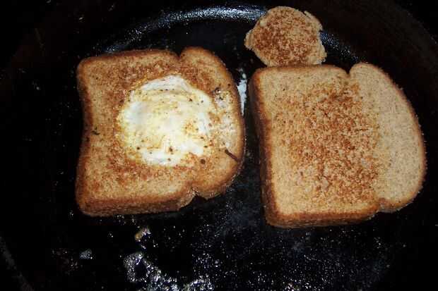 Añadir una cucharada de mantequilla a la sartén. Una vez que se haya derretido, subir el calor poco a medio-alto y añadir la rebanada de pan. Uno de ellos debe tener un agujero en él. Romper el huevo directamente en el agujero sin romper la yema. Deje que este cocinero para 1 1/2 minutos. Debería ver el huevo empieza a configurar. ¿Voltee la pieza regular de pan tostado, derecha fácil? Ahora, la estrella del espectáculo. Recomiendo utilizar una espátula ancha y Yesca. Levante con cuidado el huevo tostado deslizando la espátula debajo de él, rápidamente haciendo que usted tenga la loncha entera de pan, dale la vuelta. Tenga cuidado de no romper la yema. Si lo hace, no es biggie. Solo podría poner una tapa en ella y vapor cocine el huevo pero entonces tu pan puede llegar a ser caldoso. Digo van para el flip! Una vez que el huevo esté cocido (2 minutos o menos), es hora de montar.