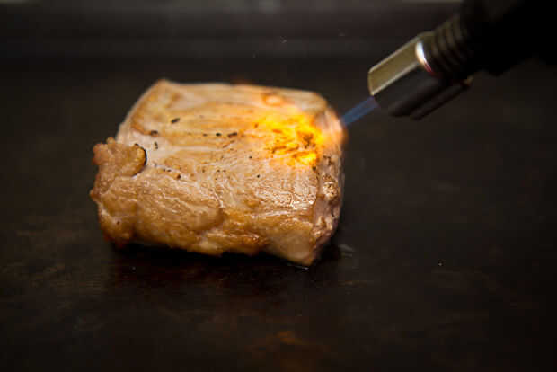 Después de la cocción sous-vide, si la carne es la plancha rápidamente puede actualizar la corteza en su carne por juiciosamente lo queme con un soplete o en un sartén caliente estúpido (500F). Este proceso es mucho más rápido y evita que un área más pequeña de la carne se cocina más.