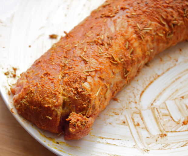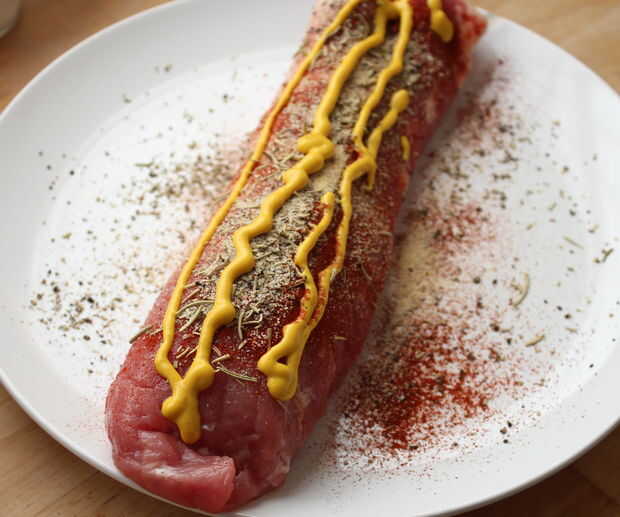 Para un lomo de cerdo, me gusta utilizar mostaza para enlazar las especias a la carne. Si no utiliza mostaza, el aceite funciona bien!