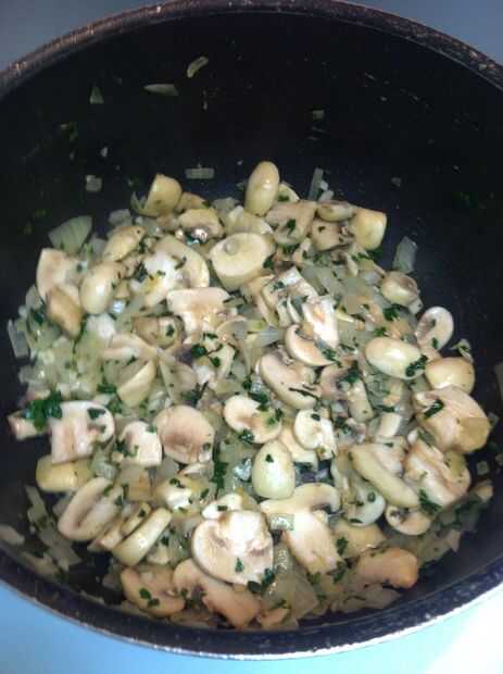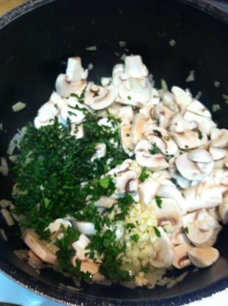Añadir champiñones, albahaca, perejil y ajo. Cocine hasta que setas a empezar a quedar suave. No quieren a la olla los champiñones así que mantener un ojo en él hasta el siguiente paso.