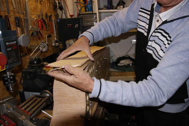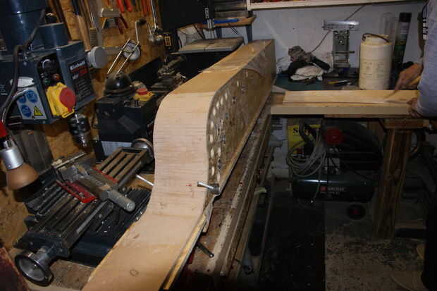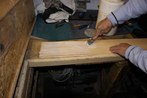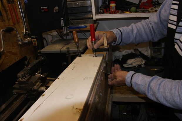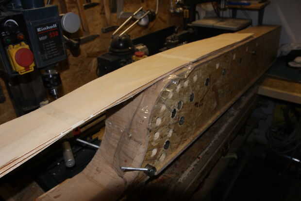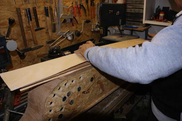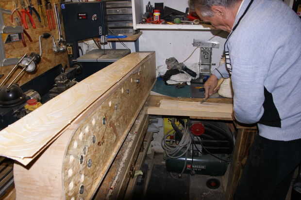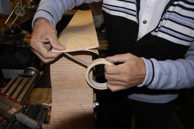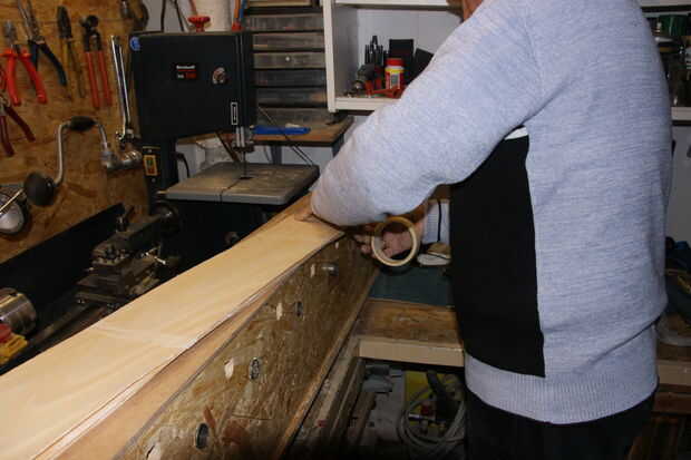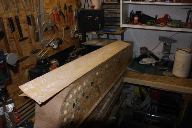Inserto en el molde a tubos de hierro para acomodar mejor los sujetadores. Pegamento del PVC se aplica a cada lado de la chapa. Yo uso cinta de selección temporal establecer chapa en tres capas, para girar la chapa frente a la unos a otros debido a la flexión. Luego usando una tabla de madera como base, comienzan a pres de chapa, doblado en forma.