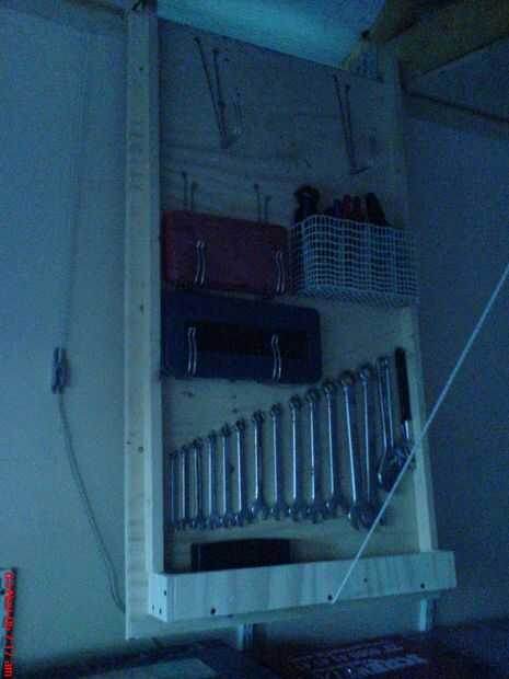 Los paneles pueden entonces organizar para sus herramientas, tornillos simple mantener una variedad de herramientas pero también usé algunos clips del metal, de los azulejos de azotea de garaje que había dejado, para montar cajas de herramientas, también pequeña caja superficial formada de capas en la base de cada panel para las probabilidades y termina.