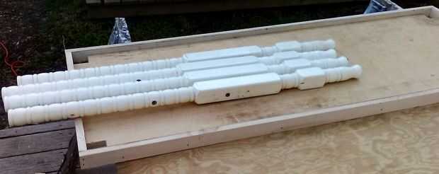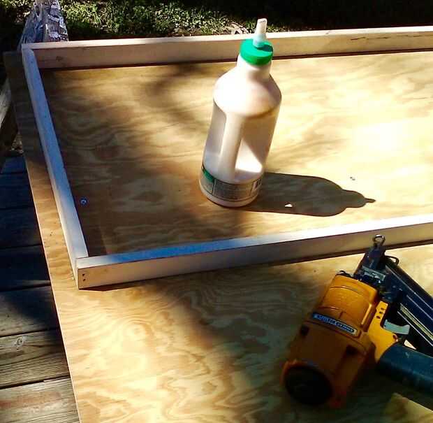 Cuelgue un extremo de la plataforma de la Sierra del caballo y mantener una pierna en su lugar mientras disparas con la pistola de clavos. Hacer para las piernas. Para reforzar los lados, arrancaron pedazos de las entrañas de cada pata todo el camino alrededor.