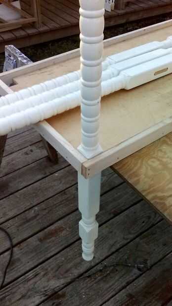 Cortar las 4 piezas de 1x4s los largos para hacer un cuadro enmarcado que se envuelva alrededor de las piernas y sostener la plataforma. Arrancó estos hasta un tamaño sobre el mismo ancho que la parte cuadrada de la pata de la cama de bebé que se vería más integrado que tendría una pieza más ancha. Utilice una pistola de clavos y dispara el marco juntos.