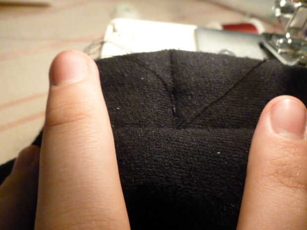Tomar su camiseta (con cuerdas) y asegúrese de que las cuerdas estén aún. Una vez que esto está cosido, no será capaz de cambiar mucho sin sacar las puntadas. Coser por el centro de la campana. Cortar los hilos sobrantes.
