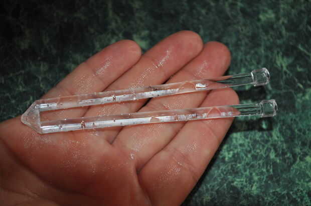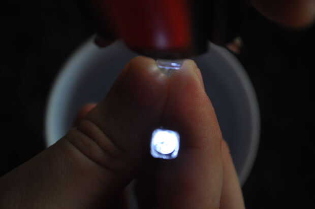 Por lo tanto, echemos un vistazo al sensor a ver cómo funciona. Es dos piezas de la barra de plástico conectadas por un pequeño cruce de plástico en la parte inferior. Las barras actúan como fibra óptica, y la Unión actúa como un espejo. Hay dos ángulos de 45 grados en la parte de Unión y estas causa la luz que entra por un lado se reflejará hacia atrás hasta el otro lado. Cuando está en contacto con esta parte del sensor, se niega el efecto espejo de la plástica y la luz no consigue reflejada hacia arriba.