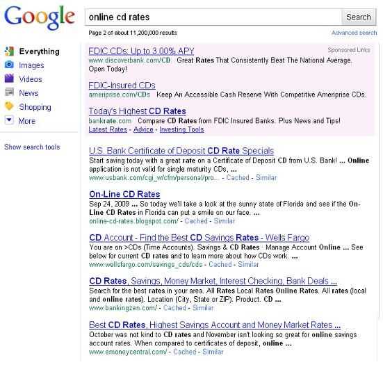 En este ejemplo, el término de búsqueda introducidas "tasas de cd en línea" en el buscador de Google, dando por resultado una lista de enlaces en la parte superior y muchas páginas de otros éxitos que siguen patrocinados. Google ya no alinea hits de relevancia para el tema de búsqueda, se enumeran en orden basado en el dinero pagado a Google, o por la manipulación inteligente de los propietarios de los sitios. Usted puede determinar que golpes a explorar más al leer la breve descripción en cada golpe o examinando la URL aparece en la parte inferior de los afectados. En el pasado, le pinchas en el título de un golpe y Google se conectará en el sitio descrito. Ahora, Google a menudo no le llevará al sitio deseado cuando se haga clic, pero te llevan a sitios totalmente sin relación que han pagado dinero a Google.