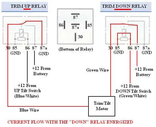 IMPORTANTE: El motor outdrive ajuste inclinación motor de la bomba sólo funcionará si ambos relés se conectan. Esto es porque el motor de la bomba de ajuste de inclinación están en serie con ambos relés. La dirección que la bomba funciona es determinada por la dirección del flujo actual a través de los relés. Esto puede ser confuso para solucionar problemas porque participan un total de 10 terminales. Al activar cualquiera de los dos relés pulsando el interruptor de inclinación hacia arriba o hacia abajo, la bobina solenoide interno se convierte en energía (debería escuchar el relé clic) y el contacto con el suelo serie se rompe y cambiado encima a una entrada de 12 voltios (terminal 87 - el cable rojo grueso). (Ver diagramas)