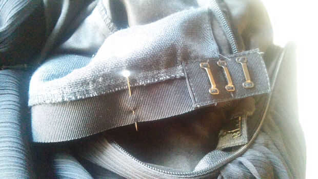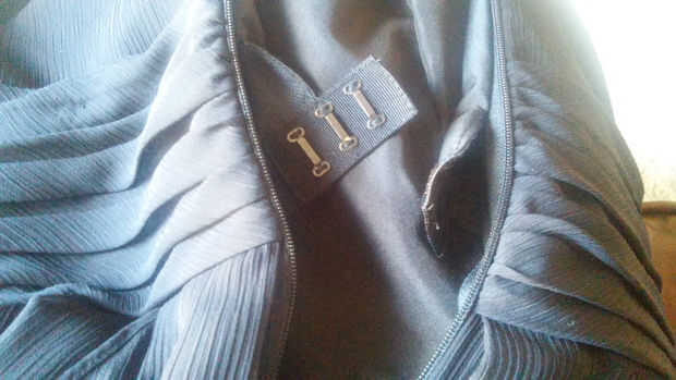 Empezar por poner en su vestido como es. No cremallera del vestido para que pueda llegar al gancho.