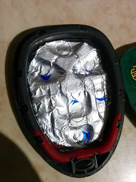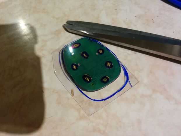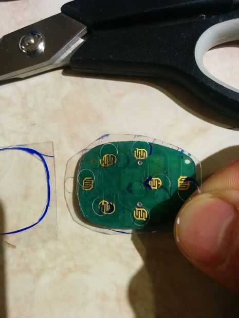 Traza el plástico usando la placa de circuito dentro del mando a distancia. Trazar sobre la tecla de contactos. Recorte el plástico cortar los agujeros con la perforadora. Coloque el plástico en el control remoto sobre el papel de aluminio.