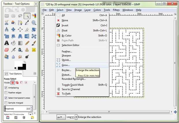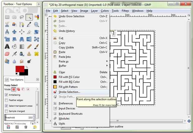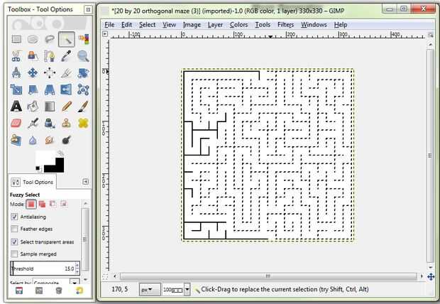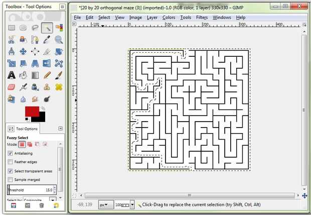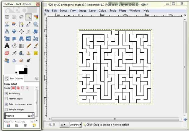 - Seleccionar un borde con seleccionar Fuzzy herramienta (si acaso tienes tiempo difícil encontrarlo: es U). La tolerancia debe establecerse bajo pero el valor real depende de la calidad de la imagen del laberinto. Si es monocromático, valor de la tolerancia 0 es aceptable. Si no, usted debe jugar con valores (si de alguna manera no puede resolver todavía sus problemas, consulte el paso 4: resolver laberintos físicos).