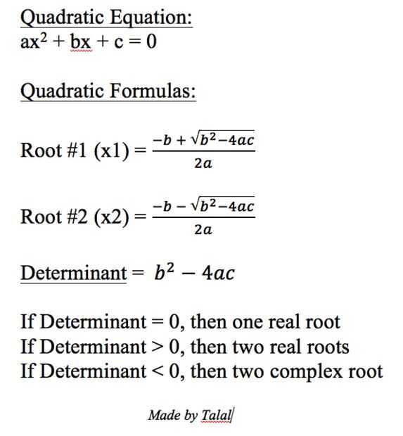 Es fundamental tener en cuenta que el coeficiente de un no igual a cero, porque una ecuación cuadrática es un polinomio de 2 º orden. Encontrar las soluciones de una cuadrática se logra al completar las plazas. Además, las soluciones de una ecuación cuadrática pueden ser real o compleja. La figura adjunta muestra la fórmula de la cuadrática y las fórmulas necesarias para encontrar sus raíces (soluciones).
