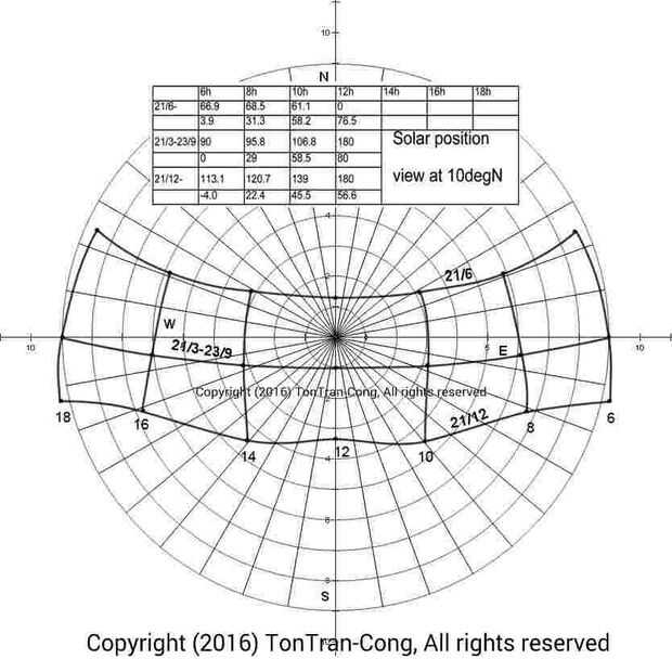 Figura: Un típico gráfico de trayectoria Solar. Este gráfico particular se hace de 10 grados al norte, para el uso en Saigon (alrededor de Tan son Nhat Aeropuierto internacional).