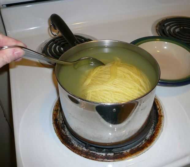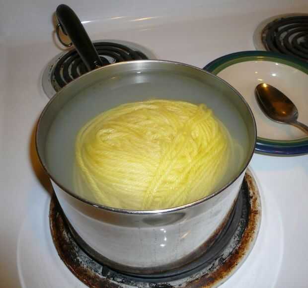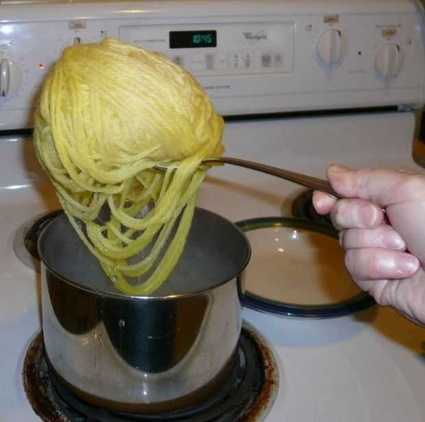 Una vez que el agua es clara, sacar la lana de la olla con la cuchara, dejar que el exceso de agua desagüe y apartar el hilo en el recipiente mientras prepara el siguiente lote de tinte.