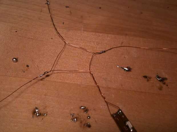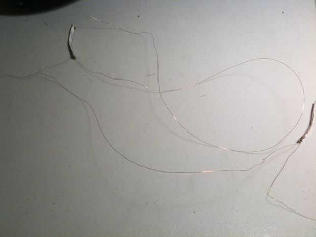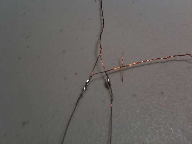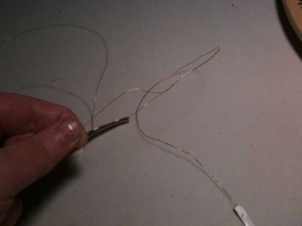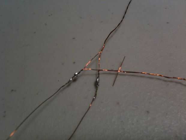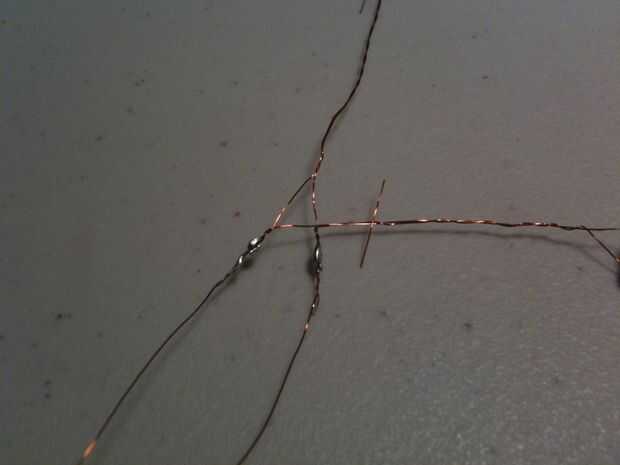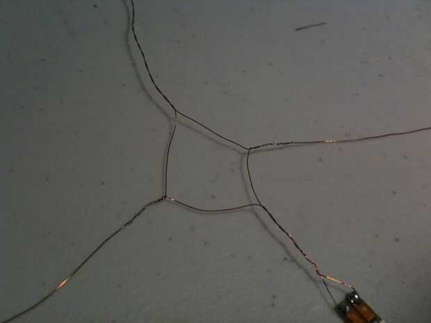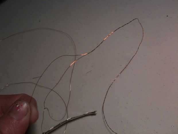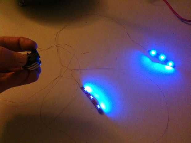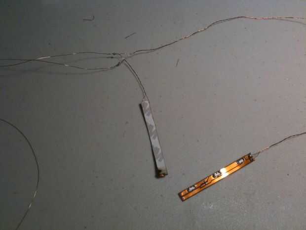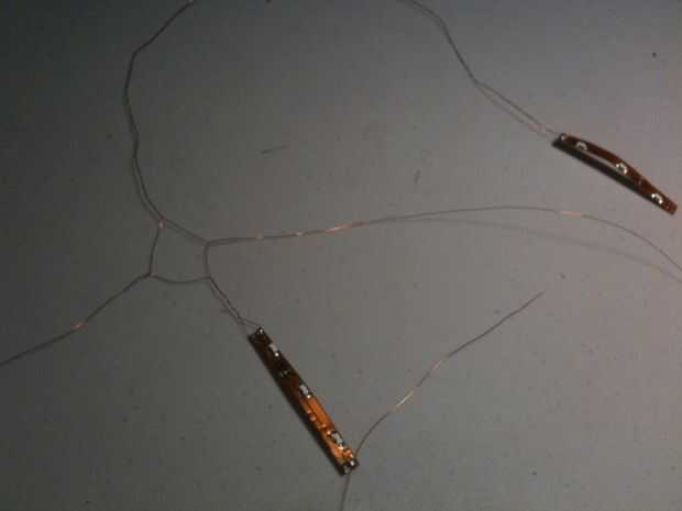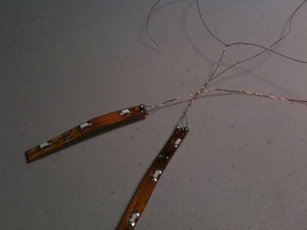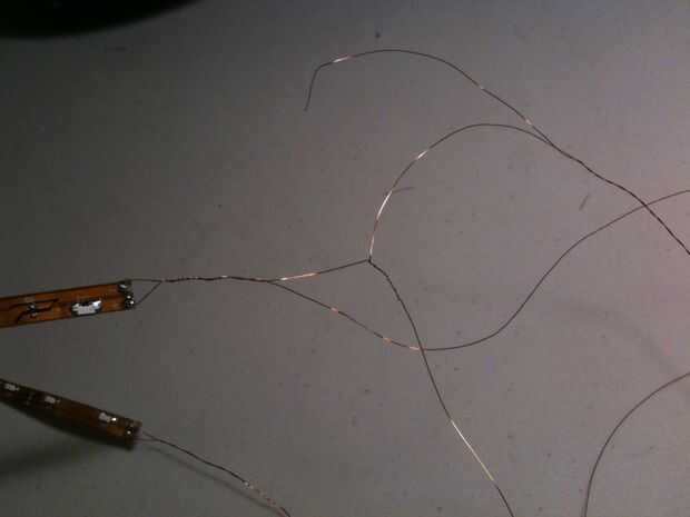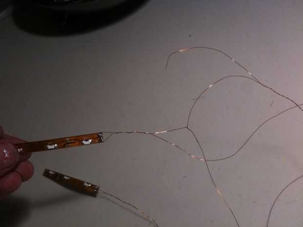 Ahora necesitas traer tus franjas de ojo en un circuito. Así que toma tu ojo corto, plan donde usted quiere las conexiones y doblarlas, para que sepas donde grabar y abrir el barniz. Tomar los cables de la parte larga y tuerza las puntas peladas para el área mediados de-línea, abierto y despojado que usted acaba de hacer. Puede probar este circuito con las pilas otra vez y ver si tiene dos tiras de luz. Si lo hace... puede soldar las conexiones nuevas, para hacer un circuito de corriente! Tan puto frío!