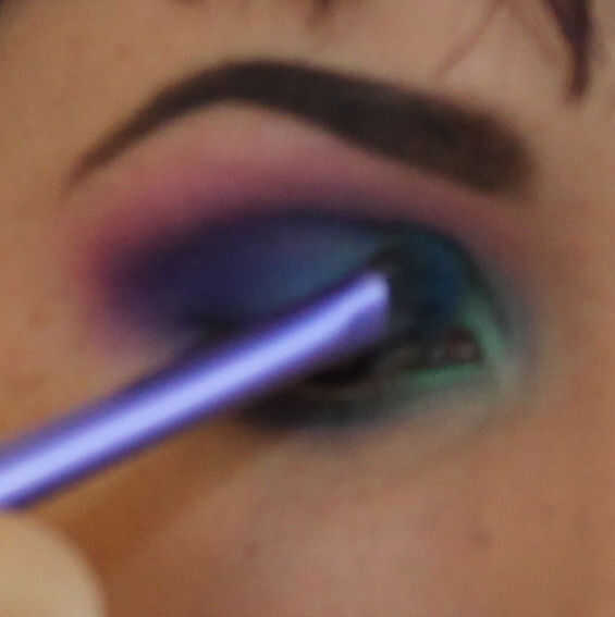 Con un cepillo de acento, aplica Freak (menta verde) a las esquinas interiores del ojo y suavemente lo cepillado sobre la tapa de mezcla con Gonzo.