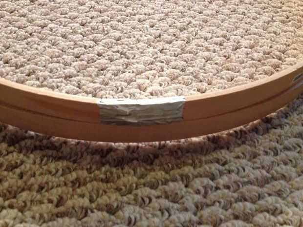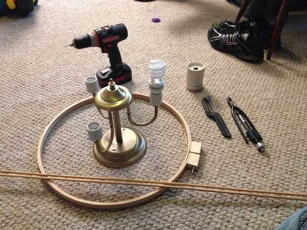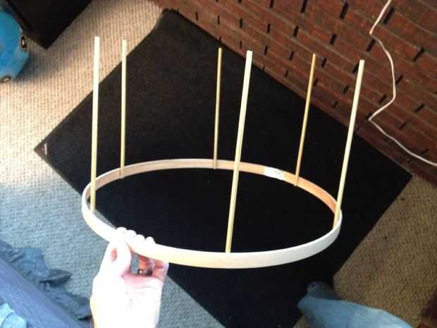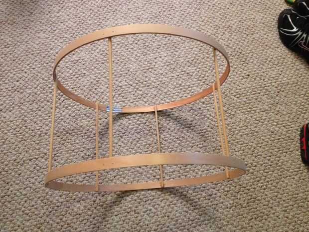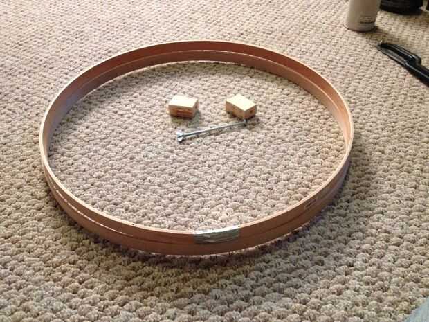 Originalmente iba a comprar dos aros del edredón, pero estando en la tienda, me decidí a usar el aro interior para el anillo superior y el aro exterior para el anillo inferior. Esto significa que el aro exterior tendrá que ser despojado de su sujeción hardware y cambiar el tamaño solo un poco para que coincida con la circunferencia del aro interior.