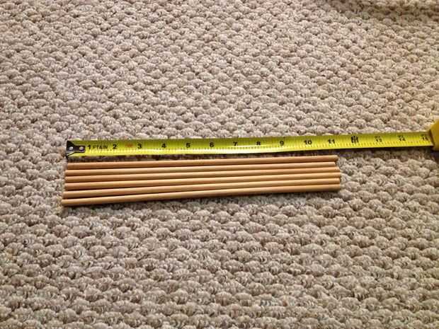 Tiempo para averiguar cómo altura desea su sombra. Puse una bombilla en mi lámpara y medido desde el piso hasta la punta de la bombilla. Fue 12,5". Sabía que no quería que la sombra toca el techo y descubierto que una brecha de 1,5"- 2" sería bueno, así que decidí 11" era el número. Corté los dos tacos en tantos 11" piezas como podría conseguir - que era de 6 piezas.