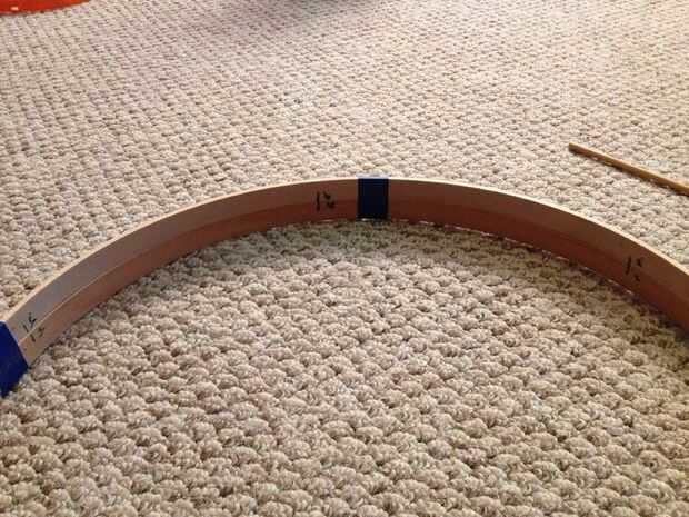 Ahora que los bloques se han ido, el aro externo debe ser redimensionada para que los diámetros son los mismos. Dependiendo de lo que usted está planeando cubrir su sombra en, usted puede poder conseguir lejos dejando los aros como de tamaño. Yo estaba planeando sobre el uso de una tela con un patrón y sabía que me gustaría que ese patrón que incluso todo el camino alrededor, así que mis aros tenían que ser del mismo tamaño. Apilados del aro exterior en la parte superior del aro interior y había pegado con cinta de pintor. Comencé en un extremo del aro exterior y pegado cada 3-4" pulgadas. He marcado donde el extremo del aro debían cortarse y tomó los aros vuelta aparte y cortarlo. Entonces utilicé algunos tape (cinta adhesiva o cinta de aluminio) para unir los dos extremos del aro exterior. Yo un par pequeños agujeros perforados en ambos lados de la articulación y utiliza un alambre de acero inoxidable para reforzar la articulación, pero no creo que era necesario.