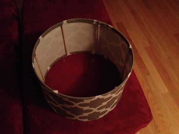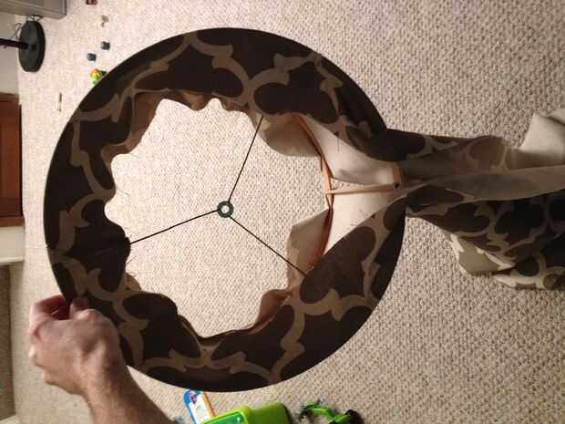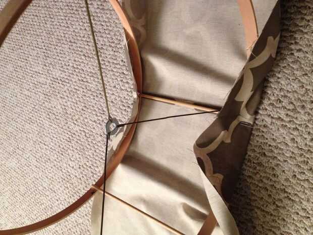 Ahora tenía 106" de largo de tela, pero sólo necesitaba ~ 57". Puesto que el patrón emparejado bastante bien en la costura, no estaba muy preocupado con que siendo de costura en la parte más visible de la sombra. Decidí envolver el marco, comenzando en el centro de mi tela en la costura. Pongo la costura en un taco para mantener el número de "sombras verticales" mínimo. Envuelve mitad de camino alrededor de la estructura, asegurando que el modelo funcionaba con el borde superior o inferior del marco y temporalmente sujeta a la tela a los aros con clips de papel. Una vez que conseguí medio camino todo me volvió a la costura y comenzó a envolver la dirección opuesta. Corte los extremos para que se le superponen 3-4". Finalmente utiliza sólo ~ 1" superposición en uno de los tacos.