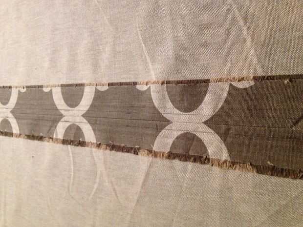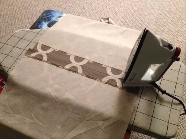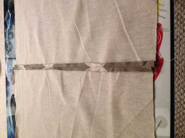 Me suturan las dos piezas y luego presiona la costura plana. Pulse la costura por la parte posterior de la tela primero y luego presione el lado del patrón. Esto le dará una buena costura plana. Tenía aproximadamente 1" de tela a cada lado de la costura. Supe que usted sería capaz de ver una banda ancha oscura cuando la luz brilla a través de la tela, así que marcado y corte una asignación de 1/4" a cada lado de la costura y presiona luego la costura plana otra vez.