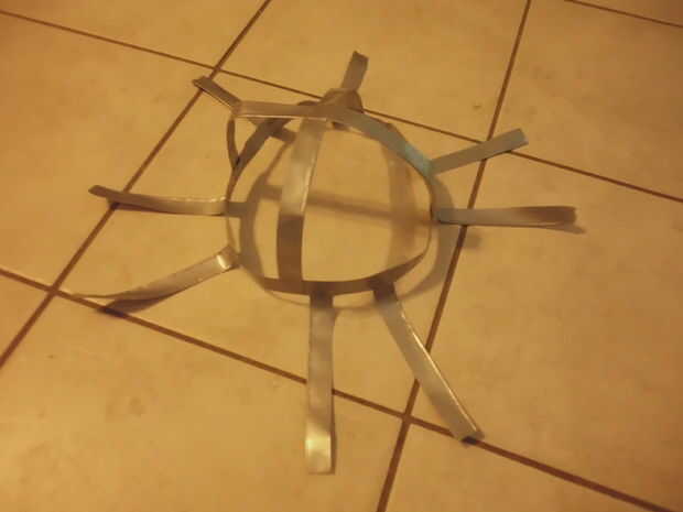 Ahora, mida con un trozo de cuerda de la parte delantera de la frente y la parte posterior de la cabeza. Imagino que esto va a formar la parte superior de su sombrero, por lo que no se hacen demasiado pequeños o grandes. Nuevo corte un pedazo de pato cinta a esta longitud y luego doblar en la mitad del largo camino por lo que será la parte adhesiva en el interior. Ahora corte otra pieza esta misma longitud y hacer lo mismo a él como lo hizo a los pedazos antes. Hacer una X con las dos piezas y asegúrelas con cinta adhesiva. Coger los extremos de las dos piezas que se utilizan para hacer una X y los extremos en el círculo que hiciste en el comienzo de la cinta.