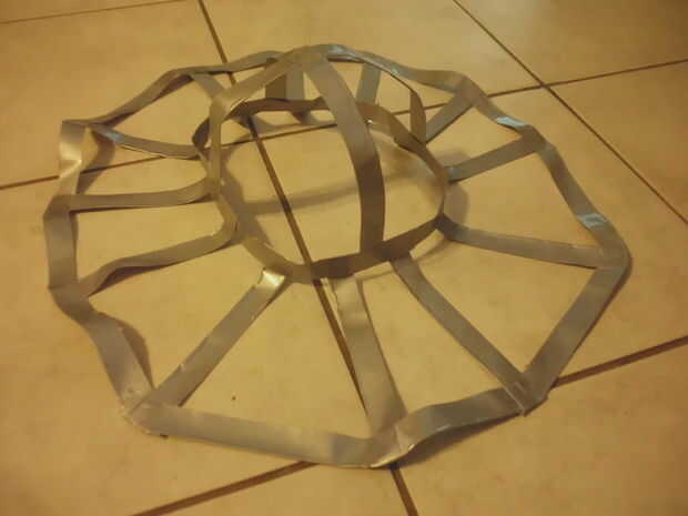 Una vez que las piezas de borde cortado y grabado juntos, con cinta adhesiva a la parte inferior de su marco del sombrero para que se peguen hacia fuera (como el ala de un sombrero para el sol). Una vez que están todos Unidos, cortar trozos de cinta y cintas que se doblan por la mitad un círculo alrededor de los pedazos del borde.