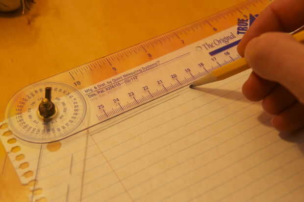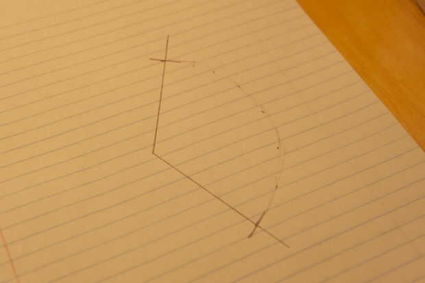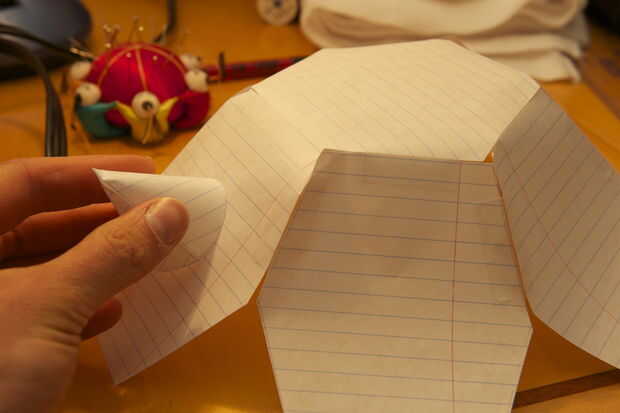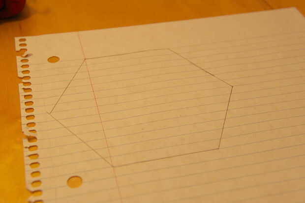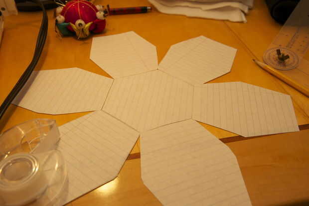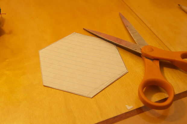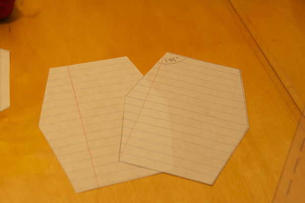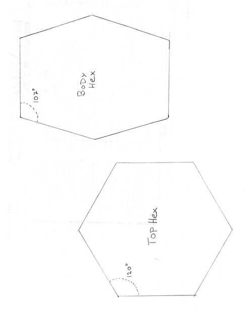Comencé a cortar hexágonos, encintado de juntas y luego ponerlos en mi cabeza. Después de algún tiempo, me di cuenta hexágonos de lado longitud 2.5 pulgadas trabajo bien para un accesorio versátil, buen sombrero. El hexágono superior es sólo un hexágono regular, con cada ángulo interior mide 120 grados. Los hexágonos de cuerpo, sin embargo, tienen dos ángulos interiores diferentes, y estos ángulos determinan hasta qué punto del plano que es el sombrero. Si los hexágonos de cuerpo eran hexágonos regulares, nuestro sombrero sería plano, pero si nos limpian los ángulos de 120 grados frontera del hexágono superior, obtenemos una forma que 'aparece' y se convierte más sombrero como. Encontré que si hacemos esos parte superior e inferior ángulos 107 grados, entonces los hexágonos se azulejo para producir una forma de sombrero muy bueno (mirar las fotos anteriores).