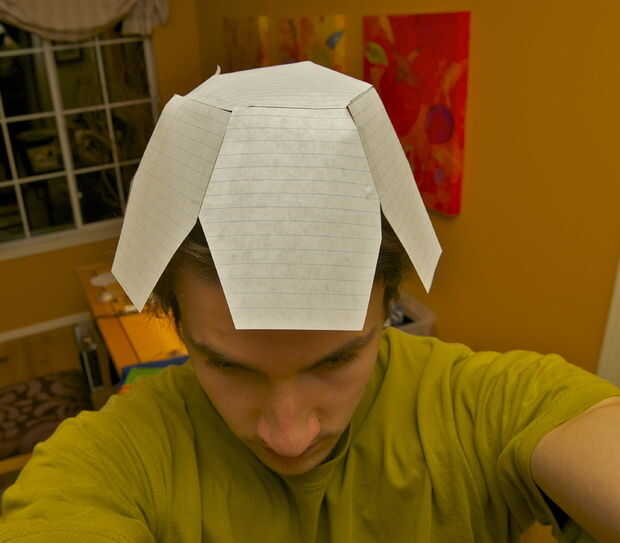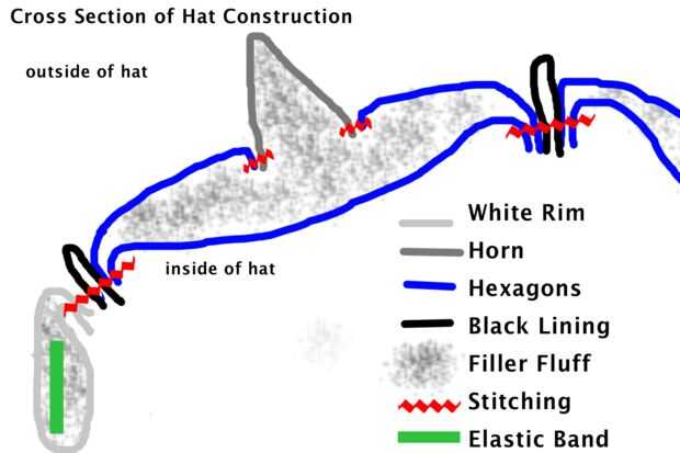 Los fundamentos del sombrero es un patrón del 7 hexágono: un hexágono regular y 6 hexágonos 'alargados' alrededor de los lados, cada uno con un cuerno blanco que sobresale desde el centro. Los hexágonos deben ser alargado porque hexágonos regulares del azulejo para hacer una superficie plana, y este sombrero es hemisférico.