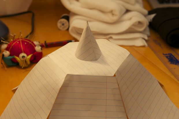 Para empezar, yo sabía que quería el sombrero para ser muy 3 dimensional, por lo que decidí hacer cada hexágono y el triángulo una almohada, lo que significa 2 pedazos de lana cosida encima de la otra, intercalando algunos material de relleno mullido intermedio, esencialmente haciendo una almohada. Los cuernos se realizará cortando una sección de un círculo en blanco paño grueso y suave, y luego lo cose para que se pliegue en un cono. Estos se adjuntarán a la pieza superior de polar azul en cada hexágono, y el interior de la bocina será 'abierto' en el interior de la almohada del hexágono (el cuerno no tiene una cara inferior, su sólo abierta al interior de la almohada).