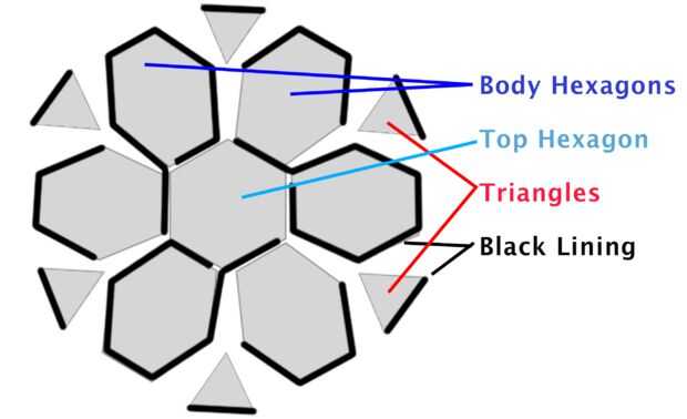 6 triángulos isósceles alrededor de los bordes llenar los vacíos entre los hexágonos y el borde blanco que va alrededor de la base entera del sombrero (que no haciendo parte del bajo vientre). Entre los hexágonos y triángulos, hay una guarnición negra que hace las formas hexagonales realmente se destacan. (todo esto se representa en el modelo anterior).