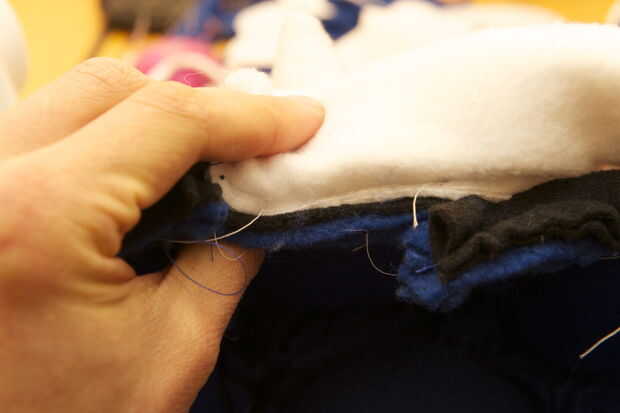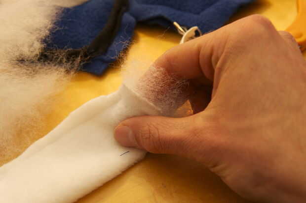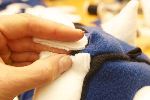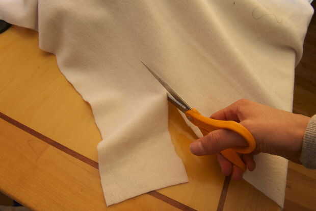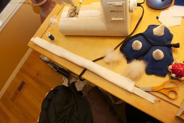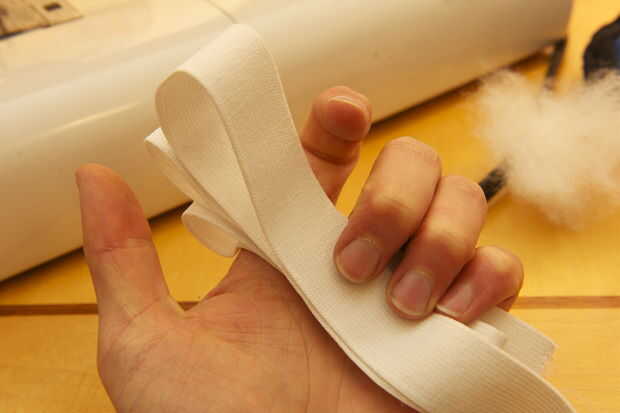 Cortar una tira ancha de 4 pulgadas de vellón blanco de 30 pulgadas de largo. Asegúrese de que usted corte para que el paño grueso y suave se extiende en la dirección de la longitud (así se estirará cuando pones el elástico). Pliegan con la parte frontal hacia fuera y alfileres. Con una puntada de zig-zag, coser por el borde (la puntada de zig-zag permite el vellocino de puntada). Ahora tome su correa elástica y poner un pin de paños en un extremo. Pulgada por pulgada, scoot el perno a través del blanco polar 'tubo' hasta su completamente a través. Llenar el tubo con el material de relleno esponjoso por empujones con un taco largo hasta que se extiende uniformemente a lo largo del tubo. Coser el tubo cosiendo a través el elástico cerca de los extremos del tubo. Recortar tus hilos!