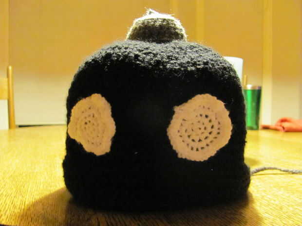este traje comenzó con papel maché sobre una pelota de playa.Usé la bola de playa como un patrón para hacer una cubierta de ropa negra para ir sobre el secado papel maché.Los ojos son de color blancos fieltro pegado al frente. La manivela en la parte
