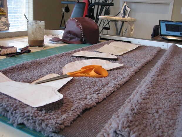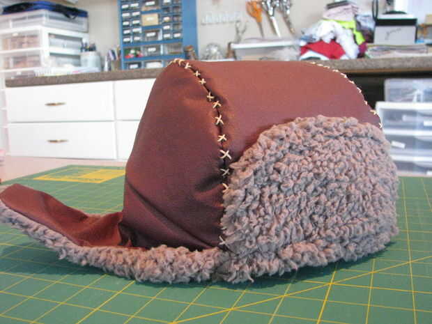 Usando el video de Threadbangers, como guía, el proyecto de su patron. Cortar hacia fuera y hacer una maqueta para poner a prueba su patrón. Una vez que concluya su diseño, cortar las piezas de cuero de la capa externa y un pelaje gris en el recubrimiento. Después de conseguir el cuero cortado, agarra algunos encerado (puede encontrarse en la sección de trabajo de cuero de tienda de su local Joann) de hilo y una aguja con un ojo muy grande. Mano coser un decorativo 'x' puntadas en las costuras de dos de la corona. Hacer el revestimiento.