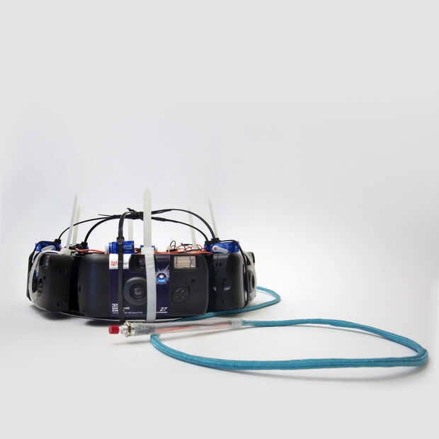 He diseñado este conjunto de cámara de algo que vi en el video musical de "Detector de Radar" por Darwin Deez. Pero, después de hacer el sombrero de la cámara, todos mantienen preguntando si era una versión low-fi de Google Street View. Es más la primera que la segunda, pero la gente puede sacar sus propias interpretaciones. También hay Chindogu.