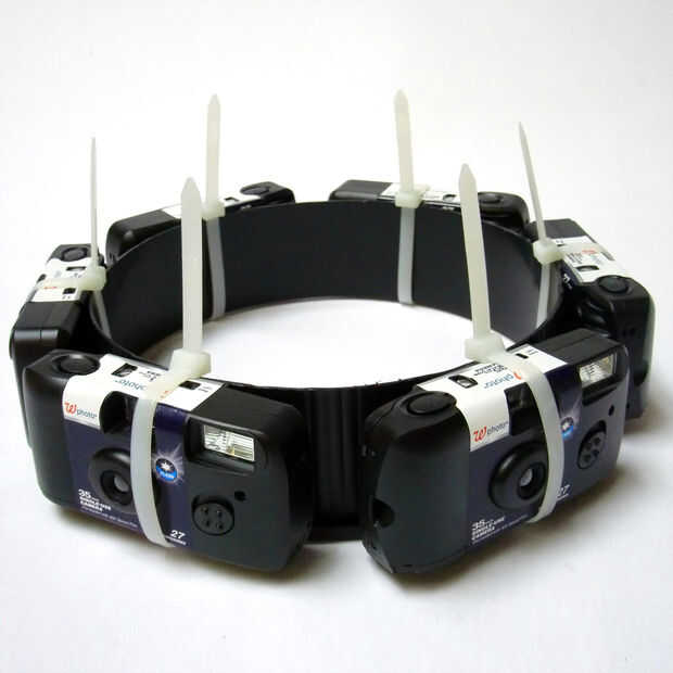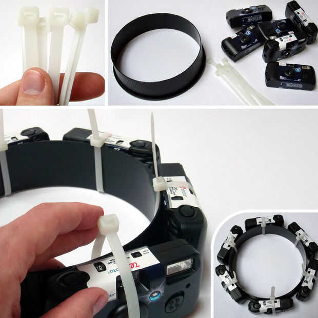 Apriete cada atadura de cables parcialmente, entonces hacer los ajustes necesarios para que cada cámara es igualmente espaciada alrededor del anillo de cubo, luego apriete cada lazo del cable para asegurar las cámaras. Asegúrese de que no cubra la lente con la atadura de cables.