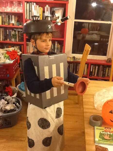 Después de ver los planes que no eran mucho mejores que su propio bosquejo (todo artilugios), encontré una serie entera de vestidos de imágenes de Google de Dalek. Pensé que si podía hacer una falda de Dalek, él podría tener un cuerpo cuadrado y cabeza de Dalek. Con un émbolo en una mano, su linterna en la otra sirven como un láser (y agarrar dulces).