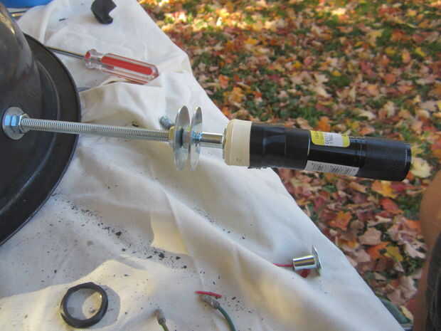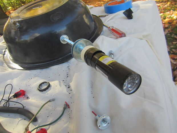 Meter la linterna en la tapa del tubo. En mi flashight, el botón de encendido/apagado está en el base final, así que tengo que quitar para encender y apagar. Si la linterna está suelta en la tapa, use alguna cinta y envuélvalo alrededor de la base de la linterna para aumentar su circunferencia. Cuando se bloquea en apretados, eres bueno para ir.