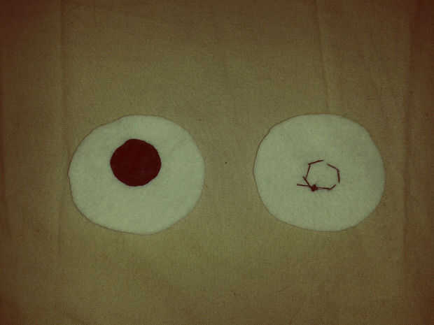 Coser los círculos negros a los blancos - que hice un poco de centro, pero jugar alrededor con ellos en la parte delantera del sombrero antes de costura para conseguir su correcto posicionamiento.