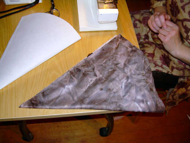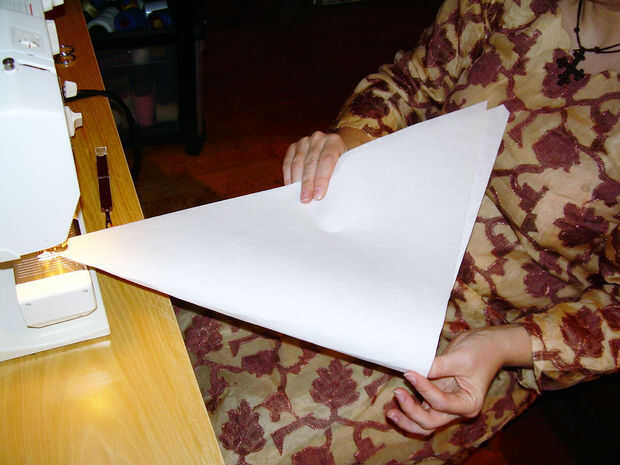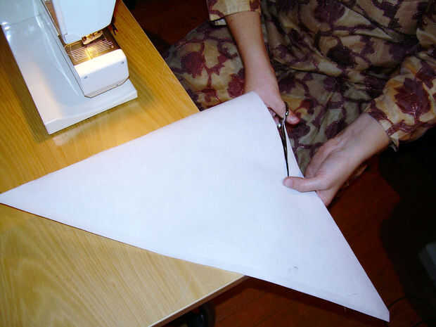 Coloque el cono sobre su tela, con la costura al lado de un borde y cortar alrededor de la parte inferior dejando aproximadamente una pulgada de margen de costura. Voltear el cono de la entretela hacia el lado adyacente de la tela para cortar la otra mitad. Coser un cono esto así.