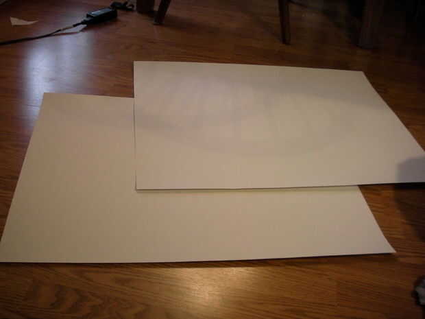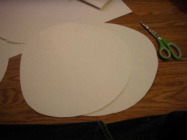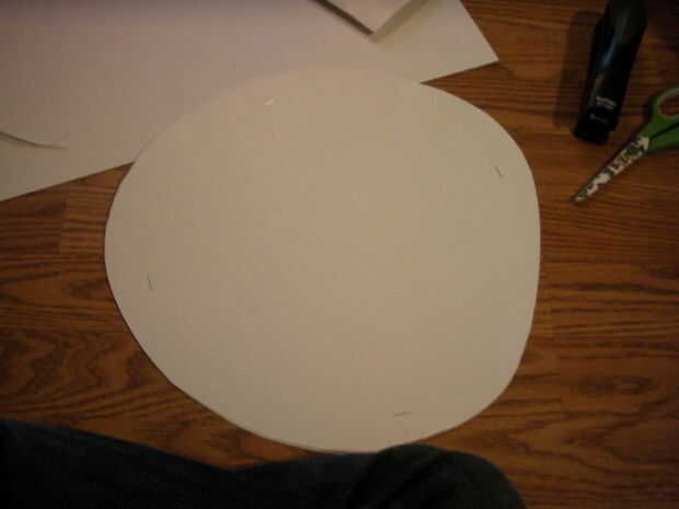 para hacer el borde del sombrero (1) tomar uno de los tableros de carteles y doblar por la mitad (mantener otra cartulina para más adelante). Entonces (2.) tomar la tijera y cortar un círculo de ella, se trata de su borde. En este momento debe tener dos círculos iguales (si no entonces hay algo seriamente mal con su papel), (3). los dos círculos juntos y engrape alrededor de los bordes.