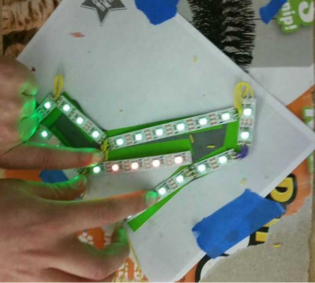 Después de que hayas decidido qué forma desea, usted puede comenzar cortando las tiras de modo que usted puede hacer la forma correcta. Para hacer el tacón imprimí un esbozo de un tacón muy alto y puso los trozos de las tiras en él para obtener la forma correcta. Desafortunadamente no tomo una foto hasta que tuviera todos los LEDs soldados. Donde hay una curva en la forma tiene que haber un descanso en las tiras de LED.