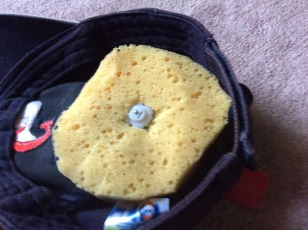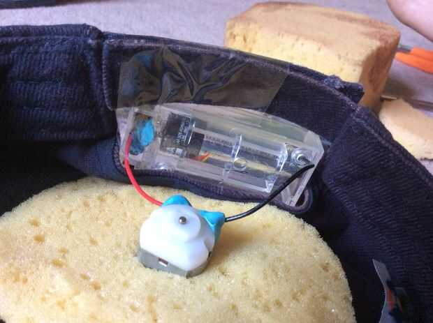 Para terminar todo, puse la esponja en el sombrero, cortar un agujero para el motor y ponga el paquete de motor y la batería en el sombrero. Necesita dejar el interruptor o dos cables rojos expuestos en la parte posterior del sombrero para encenderlo.